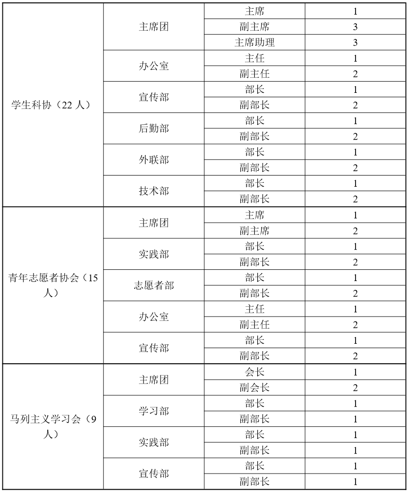 团委学生副书记面向2016级同学选拔,执行副书记面向2017级同学选拔,部长团面向2016及2017级同学选拔,每个部门正部长中关村、良乡各一名,副部长中关村、良乡各两名;