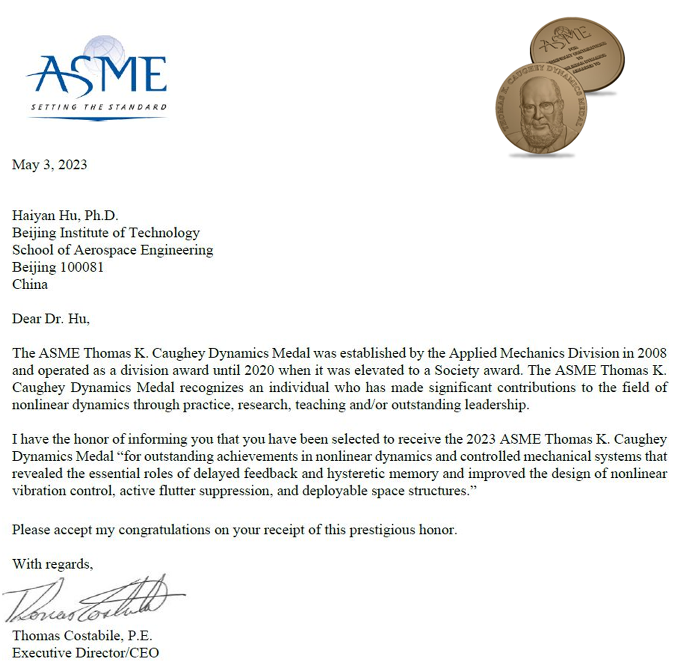 近日,美国机械工程师学会(ASME)宣布,我校胡海岩院士荣获2023年度ASME托马斯﹒考伊动力学奖(ASME Thomas Caughey Dynamics Medal)。ASME执行主席在来函中指出:我荣幸地通知,你已入选为2023年度ASME托马斯﹒考伊动力学奖获奖人,以表彰你在受控机械系统的非线性动力学领域取得突出成就,揭示了时滞反馈和迟滞记忆的基本作用,改进了非线性振动控制、颤振抑制、可展开空间结构的设计。