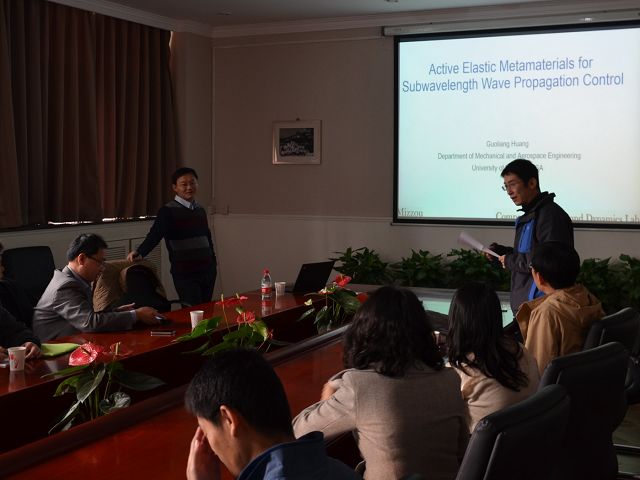 会议室作了题为“Subwavelength Wave Propagation Control by Using Active Elastic Metamaterials”的学术报告。报告主要介绍了利用压电材料、电学器件以及电流变材料等主动机制设计弹性波超材料的方法。主动机制的引入,可以为超材料设计提供更宽泛的设计空间,在声子晶体的禁带优化设计、板波的控制中带来更丰富的现象和更灵活的设计手段。