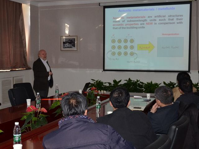 会议室作了题为“Advances on acoustic metamaterials and Acoustic Cloaking”的学术报告。报告介绍了基于优化技术的隐身结构设计方法,并对3D打印的样品进行了实验验证,实验结果与数值模拟十分吻合。该设计在声学隐身方面具有重要的应用前景。