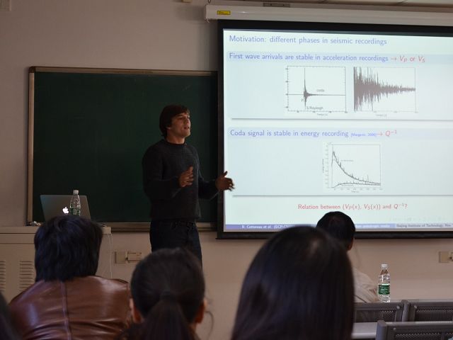 11月6日下午,Cottereau教授在在研究生楼210作了题为“Propagation of elastic waves in random anisotropic media and numerical observation of diffusion”的学术报告。报告介绍了随机各向异性弹性介质中波传播问题的模型和数值计算方法,并且主要强调随机介质中波传播的弥散现象。将该模型应用于地震波问题,能够解决传统各向同性地层模型中分析结果与实际地震记录的不匹配问题。