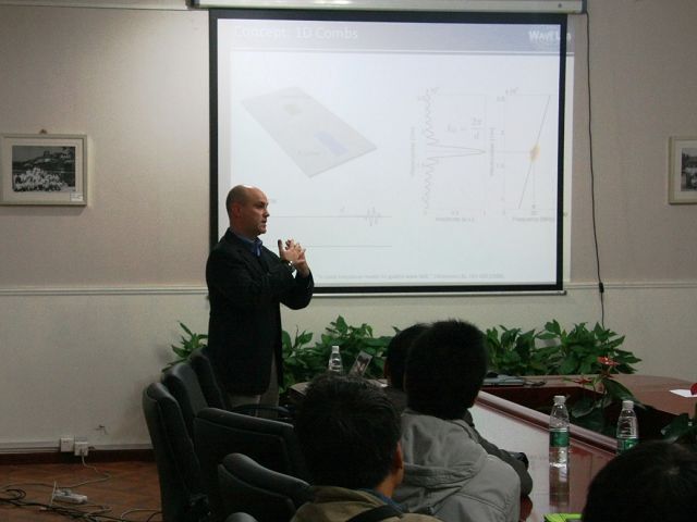 会议室作了题为“Structural Health and Strain Monitoring Sensing Through Fourier-Based WaveTransducers”的学术报告。报告介绍了应用于结构无损健康监测的一类新型超声波发射与传感器,该器件基于空间傅里叶变换而设计,能够通过操作频率的改变而控制发射与感知波束的方向。该技术对结构缺陷以及变形状态的探测具有重要前景。