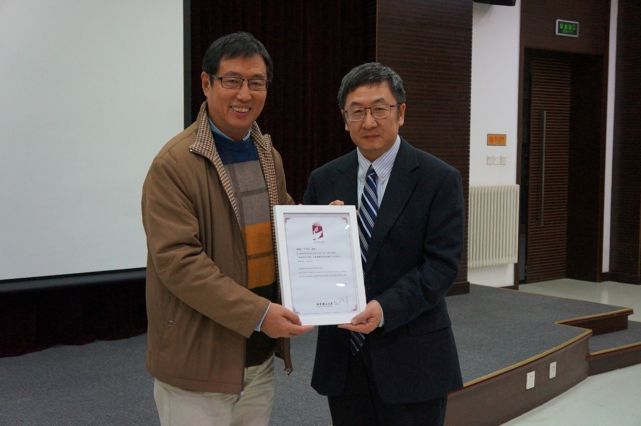 院长胡更开教授为何国威院士颁发了北理工“百家大讲堂”讲座证书。
