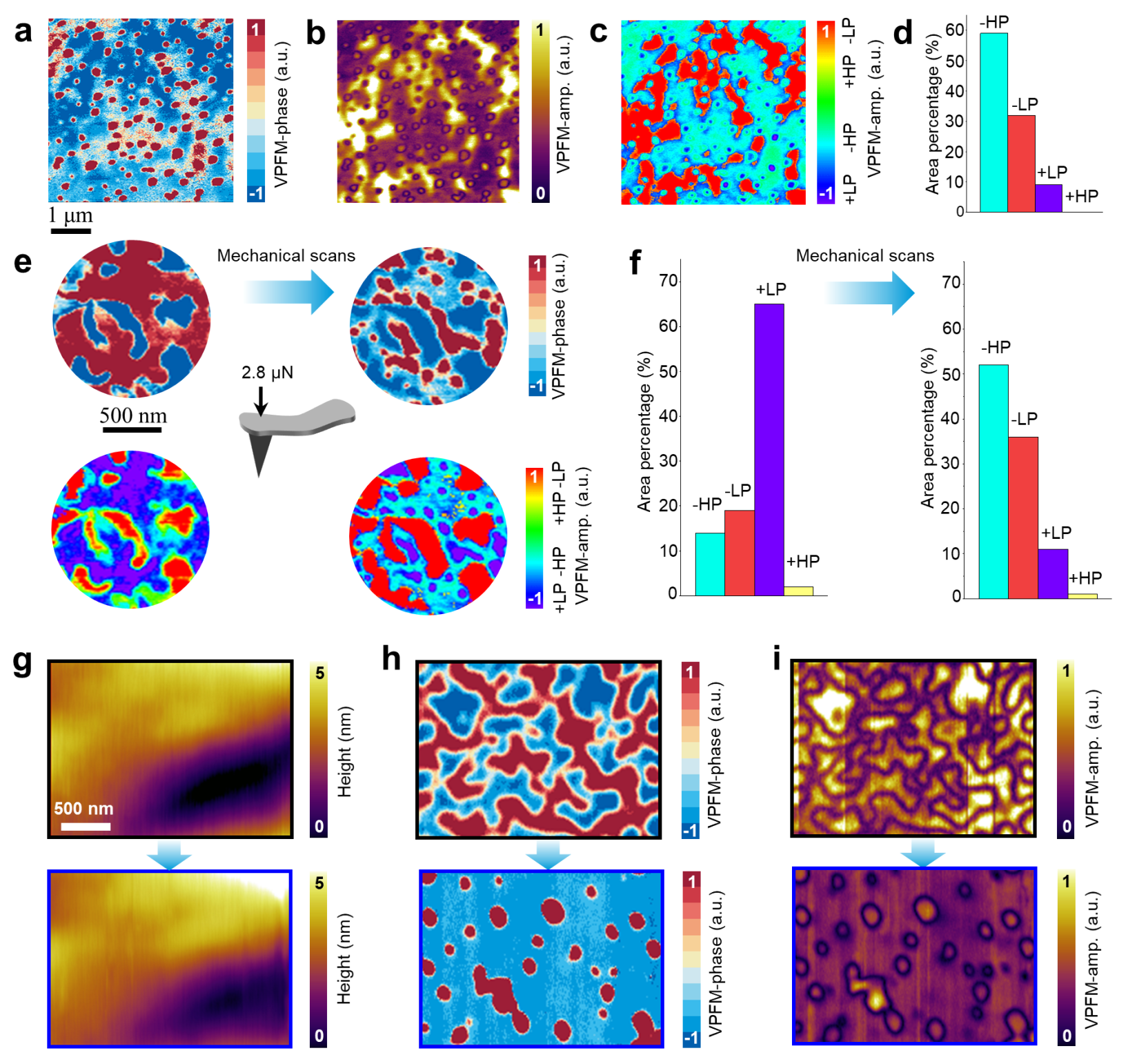 1. 在迷宫畴富集区域,通过AFM针尖进行力扫描,可诱导LP相向HP相转变,并导致迷宫畴到气泡畴的形态变化,该过程可实现无损的铁电拓扑结构形成。