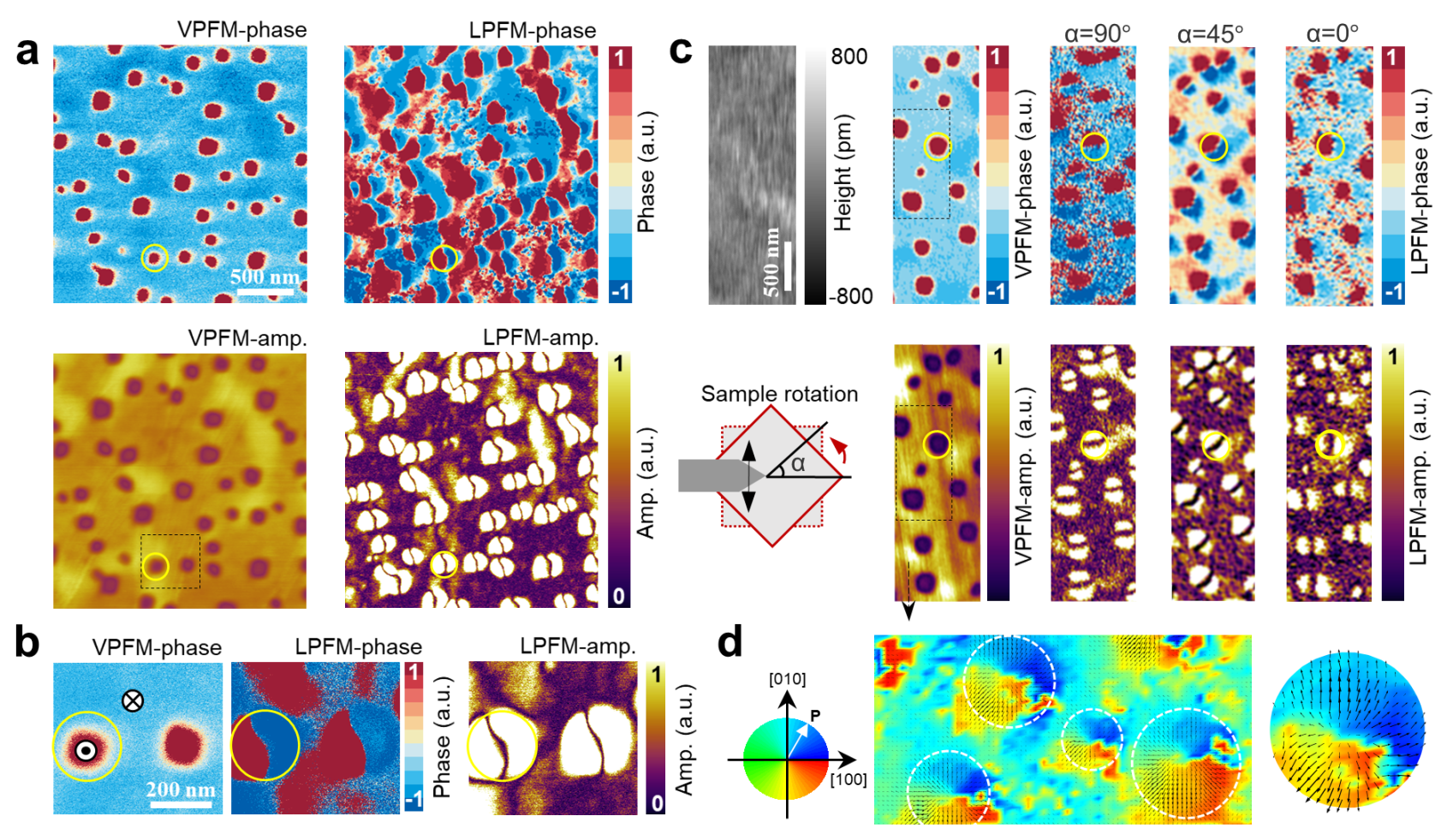 3. PFM振幅图像揭示气泡畴周围存在压电振幅的明暗差异,与其LP/HP相的共存密切相关。